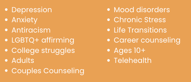 My approaches include mindfulness based CBT, ACT, and client-centered therapy. My focus is on helping individuals overcome anxiety, depression, self-esteem issues, and relationship struggles. I love to incorporate activities, games, or music into sessions to collaborate artistically with clients to have a little fun while working hard together.