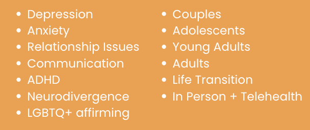 I work with adolescents, young adults, adults, and couples — especially around relationships, communication, anxiety, depression, ADHD, and neurodivergence. My style is person-centered and grounded in an interpersonal process approach, and I also draw on Cognitive-Behavioral Therapy (CBT) and Interpersonal Therapy (IPT) techniques to help clients explore themselves and their connections with others.